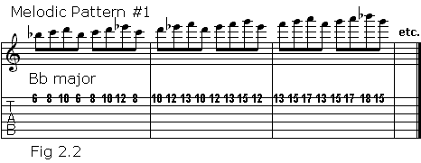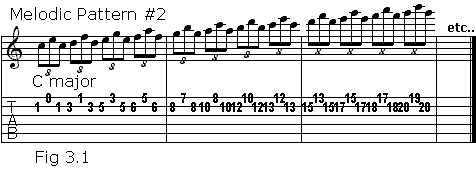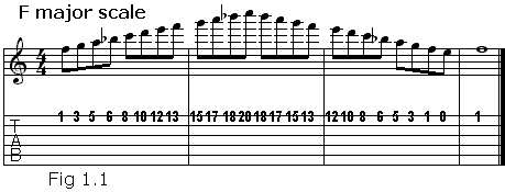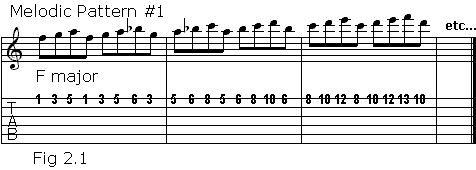 Let's go a step further and use some melodic patterns. This would probably work best using the first, second and fourth fingers. We'll use the F major scale on the high E string: